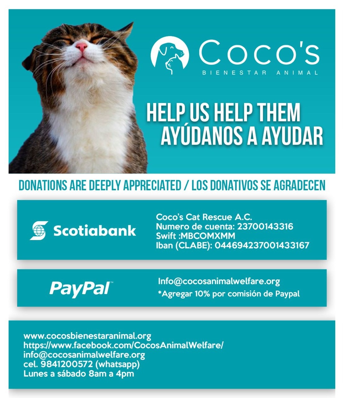 Se necesitan donativos para financiar nuestros programas de esterilización y también el de adopción. Cocos depende de la generosidad de las personas para que sigan donando y así continuar ayudando a los animales en nuestra comunidad.